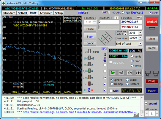 빅토리아 프로그램은 플로팅의 평균화 방법을 사용합니다. 작동 중인 HDD의 경우 그래프는 일반적으로 단계를 볼 수 있는 부드럽게 떨어지는 선입니다.
