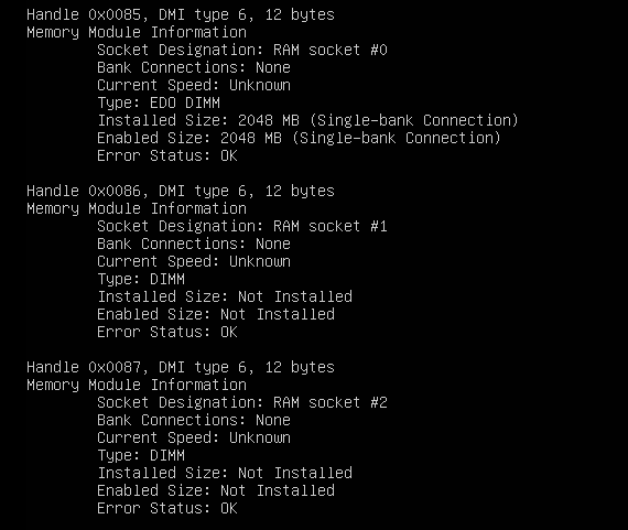 다른 명령어와 다르게, 메모리 소켓별 정보가 출력된다.