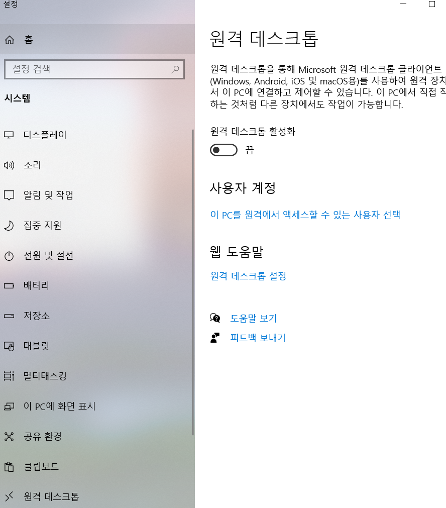 설정-시스템-원격데스크톱 활성화