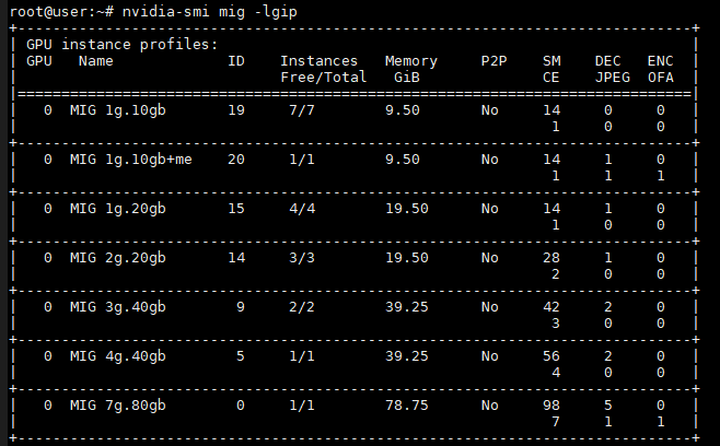 >>nvidia-smi mig -cgi 19,19,19,19,19,19,19
