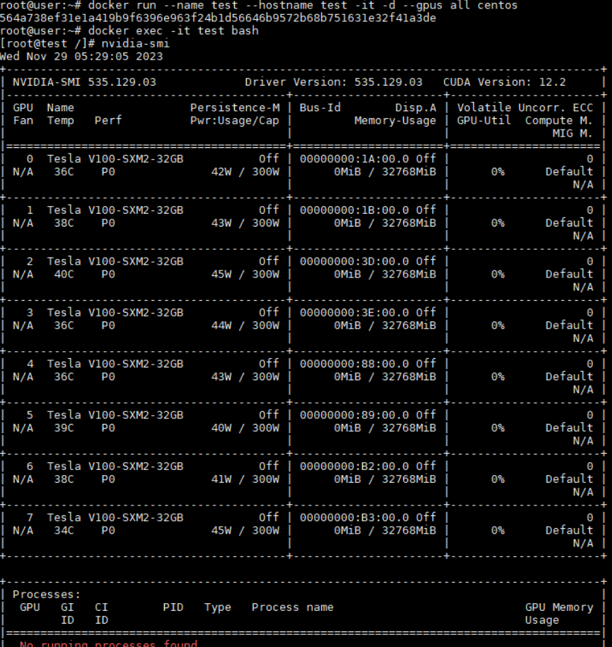 root@user:~# docker run --name test --hostname test -it -d --gpus all