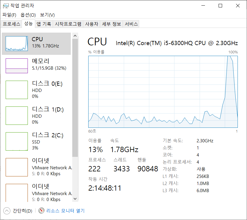 디스크 사용률이 100%(ctrl+alt+del -작업관리자-성능에서 확인 가능.)로 고정되는 문제이다.