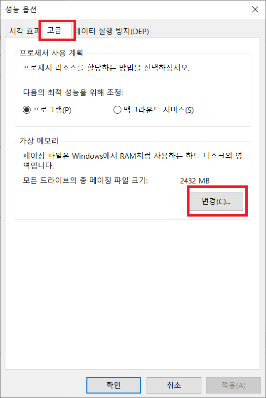 고급-가상 메모리 -변경(C)...