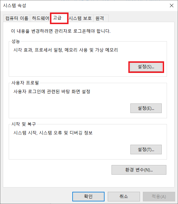 시스템 속성 - 고급 - 성능 - 설정