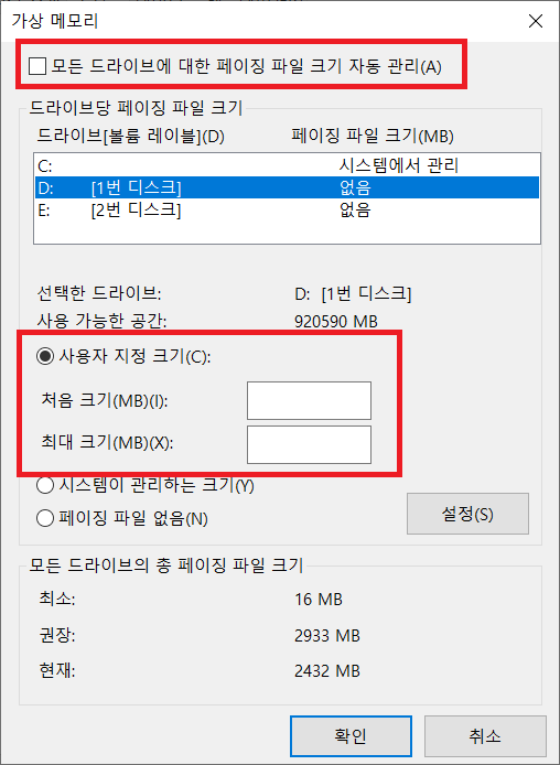 모든 드라이브에 대한 페이징 파일 크기 자동 관리(A) 체크박스 해제