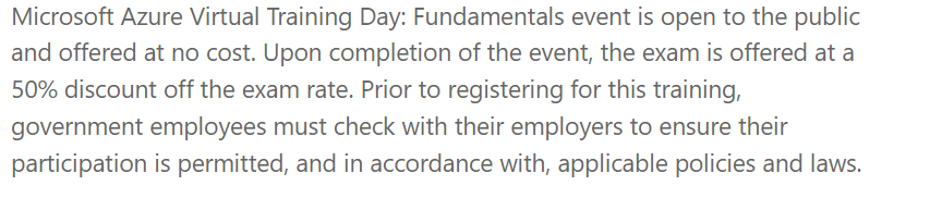 다만 이제는 Virtual training day의 Fundamentals 강의를 수강하면 자격증 50%할인 바우처를 얻을 수 있다.