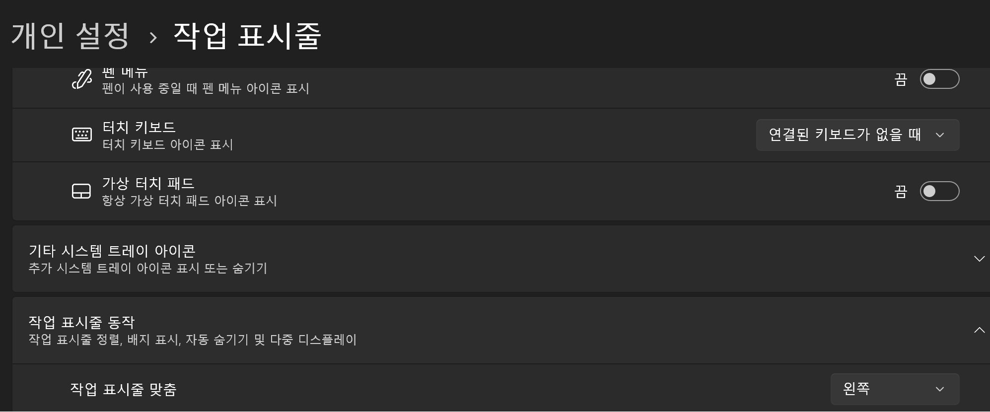 개인설정 > 작업표시줄 > 작업표시줄 동작 >작업표시줄 맞춤 -왼쪽
