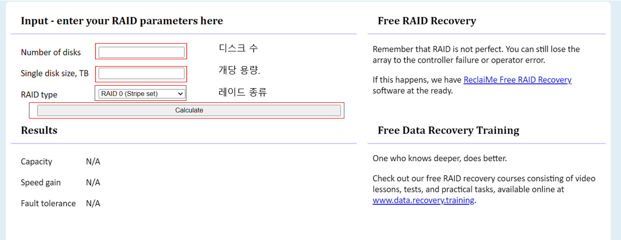 복잡한 RAID 용량 계산을 간단하게 해볼 수 있는 페이지입니다.