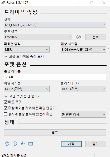 장치 - > DOS부팅 USB로 만들어 줄 장치 선택.