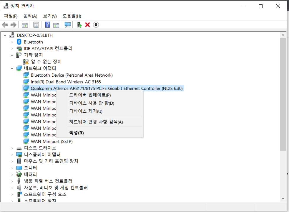 장치관리자 : 사용중인 로컬 네트워크 어댑터 디바이스 사용안함(D)-> 다시시작.
