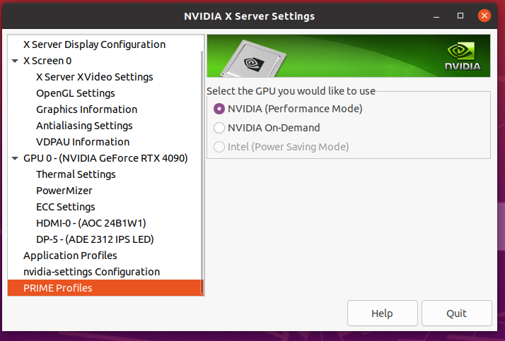 Nvidia X Server Server Settings - PRIME Profiles -NVIDIA(Performance Mode)