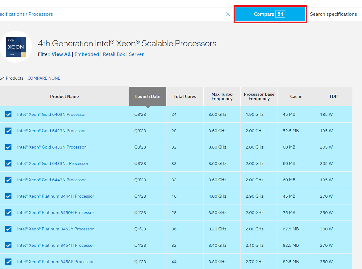 모든 프로세서가 선택되며, Compare를 클릭해줍니다.
